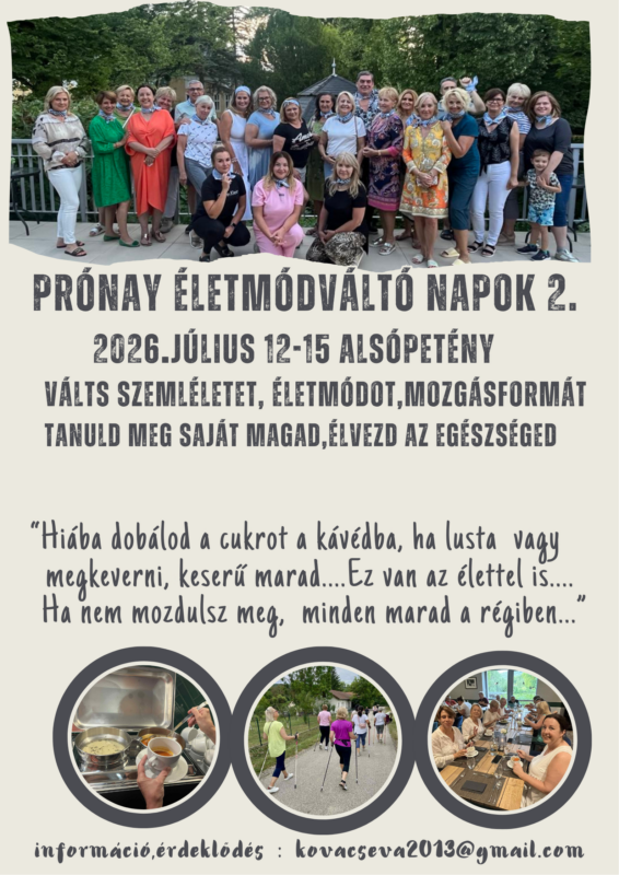 A tavalyi Prónay Életmód váltó napok sikerein felbuzdulva, idén is hirdetünk 4 napos kihívást. Rengeteg tapasztalatot szereztünk az első táborunk alatt, így annak eredményeit felhasználva bízunk benne hogy az ez évi életmódváltás könnyebb és sikeresebb lesz annak, aki megtisztel minket a jelenlétével. Egy nagyon hasznos 4 napot töltünk el együtt, ahol mindenki kipróbálhat új mozgásformákat, kényeztetheti magát a wellnessben és sokat tanulhat magáról, a testéről, az anyagcseréjéről és a fittségi állapotához illő mozgásformákról, úgy hogy közben nem éhezik.